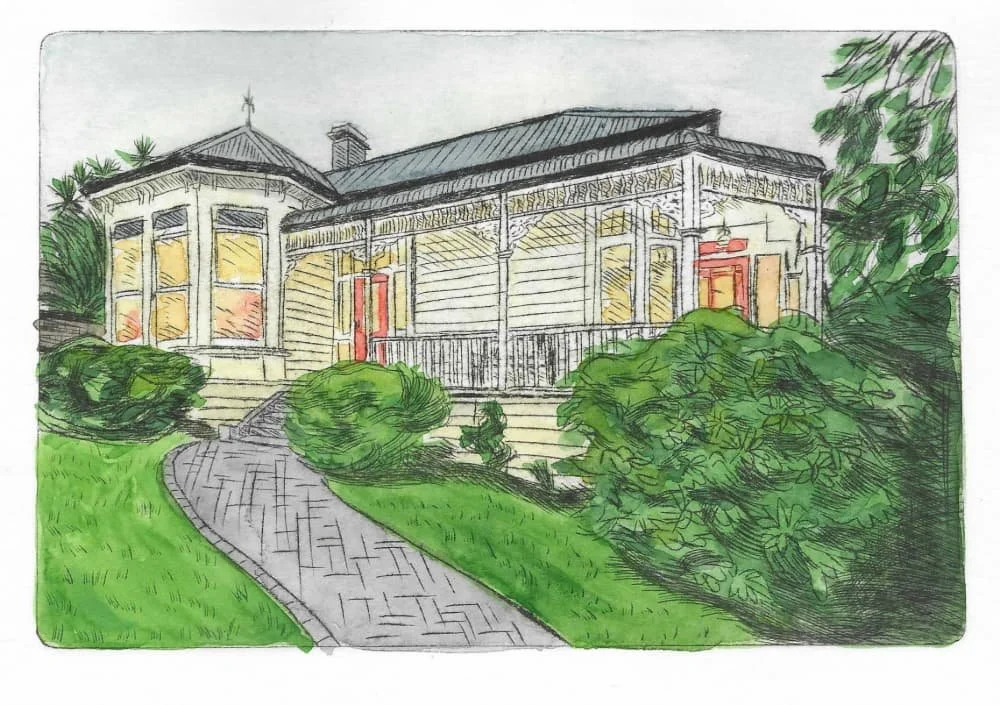 Since graduating from Otago Polytechnic in both Fine Art and Fashion Design, Fiona has continued to develop a distinctive style that combines drypoint etching with watercolour and other mixed media. Her work often centres around familiar spaces, homes, streets, and local scenes, approached with a softness and attention to detail that makes each piece feel both intimate and recognisable.